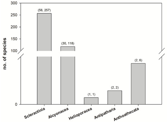 Based on the results from extensive biological surveys conducted from 1975 to 2019, a total of 384 species of Cnidaria has been recorded in DA, including 257 species in 56 genera of the Scleractinia family, 118 species in 30 genera of the Alcyonacea family, two species in two genera of Antipatharia family, one species in one genus of Helioporacea family, and six species in two genera of Anthoathecata family (Figure 2).