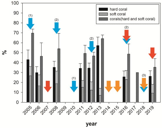 Temporal dynamics of the corals (hard and soft corals) in the Dongsha Atoll from 2005 to 2019. Eleven typhoons (blue color) and six bleaching events (orange: level 1; red: level 2) occurred in this period. The number in the parentheses indicates the number of typhoons.