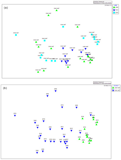 Multidimensional scaling (MDS) plot of the species composition and abundance of corals: (a) among various sampling periods (2006, 2012, and 2019); (b) among various locations (outer reef and inner reef).