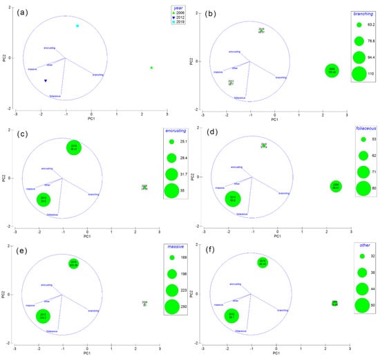 Principal component analysis (PCA) of the coral colonies from the inner reef of the Dongsha Atoll for three sampling periods (2006, 2012, and 2019): (a) hard corals; (b–f) the five functional categories of corals: branching, encrusting, foliaceous, massive, and others. PC1 accounted for 89.3% of the variability, and PC2 accounted for 10.7%. The size of the green circles indicates the number of coral colonies.