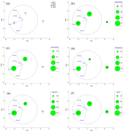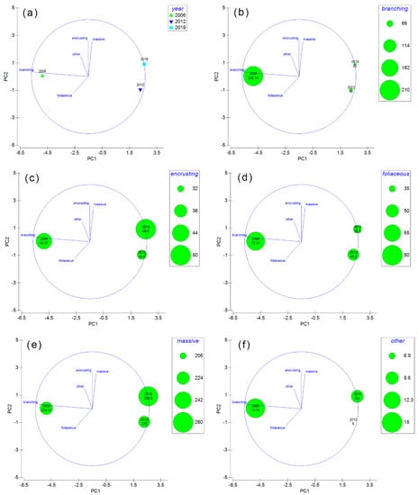 Principal component analysis (PCA) of the coral colonies from the outer reef of the Dongsha Atoll for three sampling periods (2006, 2012, and 2019): (a) hard corals; (b–f) the five functional categories of corals: branching, encrusting, foliaceous, massive, and others. PC1 accounted for 95.3% of the variability, and PC2 accounted for 4.7%. The size of the green circles indicates the number of coral colonies.
