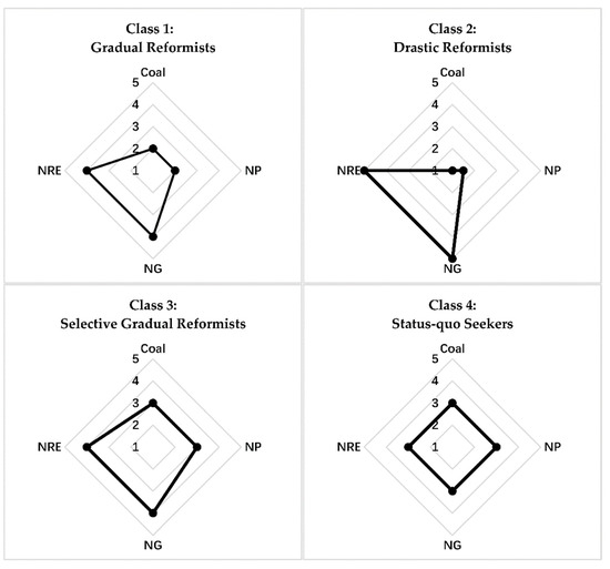 In Class 3, “should be maintained at the current level” was the most frequent response for coal (62.56%) and nuclear power (58.29%). The phrase “should be expanded gradually” corresponded to natural gas (81.04%) and new renewable energy (89.10%). That is, this class shows a relative preference for maintaining coal and nuclear power at their current levels and a strong preference for the gradual expansion of natural gas and new renewable energy. In other words, the dominant preference for gradual energy source reform is found selectively for natural gas and new renewable energy. Thus, we designated Class 3 as the Selective Gradual Reformists segment.