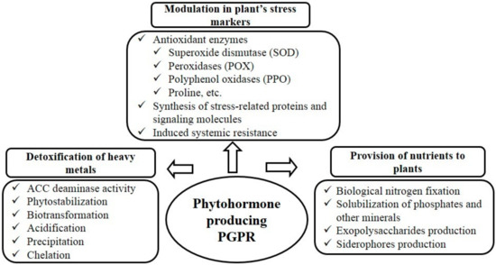 Use of phytohormone-producing heavy metal tolerant plant growth promoting rhizobacteria (PGPR) can be used as an alternate strategy to decontaminate heavy metal-polluted soils, which is a more efficient, inexpensive, sustainable, and ecofriendly approach [28]. The PGPR produce phytohormones, in addition to several other growth-promoting traits, can reduce the heavy metal toxicity and improve crop growth under heavy metal polluted soil conditions [29,30,31]. Phytohormone-producing Cd-tolerant PGPR can be effective to induce resistance against heavy metal toxicity in crop plants. Scientists have reported a number of Cd, Pb, Ni, As, Zn, Cu, Fe, and Cr-tolerant PGPR strains belonging to different genera such as Ochrobactrum [32], Bradyrhizobium [33], Chryseobacterium [34], Klebsiella [35], Serratia [36], Bacillus spp. [37], Ralstonia [38], Exiguobacterium [39], Stenotrophomonas, Morganella and Providencia [40], Enterobacter [11,41], Leifsonia [42], Burkholderia phytofirmans PsJn [31], Burkholderia cepacia [43] Pseudomonas fluorescens [44], and Pseudomonas aeruginosa [45]. These strains have been well documented to have multifarious plant growth-promoting traits, in additions to phytohormone producing ability, and thus can be used to develop biofertilizer for inducing heavy metal stress tolerance in crop plants. This review provides an overview on the current status of application of plant growth-promoting rhizobacteria to confer resistance against heavy metals in plants as a most feasible alternate strategy. Special attention has been given to the potentials of exogenous application of phytohormones, especially the phytohormones producing plant growth and promoting rhizobacteria in remediation of metal polluted soils and healthier crop production.
