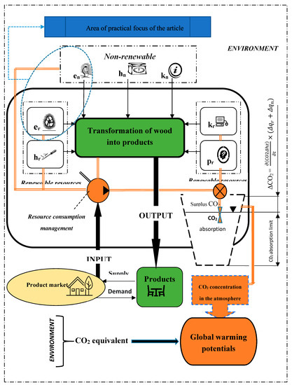 In the same way, further increases in CO2 emission values could be linearised depending on the volume of the supplied resource during a certain period. Then, equations can be created whereby it is possible to describe the behaviour of the wood processing industry. The greatest increases in CO2 are represented by non-renewable material and energy sources. However, even renewable sources represent CO2 emissions (e.g., in the production of equipment—a power plant powered by a renewable source). Even the creation of tacit knowledge is a marginal source of CO2 growth [40]. For example, to create knowledge about the technological process of wood processing, a set of experiments must be performed in which matter is transformed using energy.