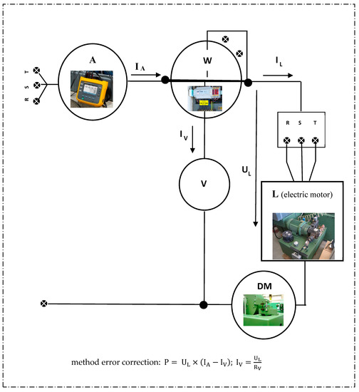 An electric motor of the milling machine is connected as a load (L) to perform the main milling movement. The Gossen A2000 multifunction wattmeter, Prague [CZ], (W) was used to measure and record the instantaneous power. The wattmeter measures the instantaneous voltage and current values of three phases (R, S and T). In addition, a VoltCraft Vc-610Bt voltmeter (A), Prague [CZ], was used in the role of an ammeter, and a GW Instek GDM-8341 voltmeter (V), Prague [CZ], was used to correct the voltage drop because of wattage consumption. On the given production equipment (Copy Milling Machine COSMA-SKS 7), we performed an electricity consumption per production batch experiment (one production cycle of four workpieces). We also determined the mechanical power of the engine for determining the efficiency of the production machine (η). We performed the reaction torque measurement with a DIS CV-505 dynamometer (DM), Prague, [CZ]. For this characteristic, we measured the reaction moment. When a force is applied at the end of the arm, the beam is deformed and detected by the strain gauge (its electrical resistance varies depending on the magnitude of the deformation). The changed resistance is then converted to voltage, and the torque value is shown directly on the display and stored in memory. The mean torque value and the corresponding spindle speed then determine the motor’s mechanical power (PM) according to Equation (18), which was further used to assess the efficiency of the milling process (see Figure 3 and Table 1):