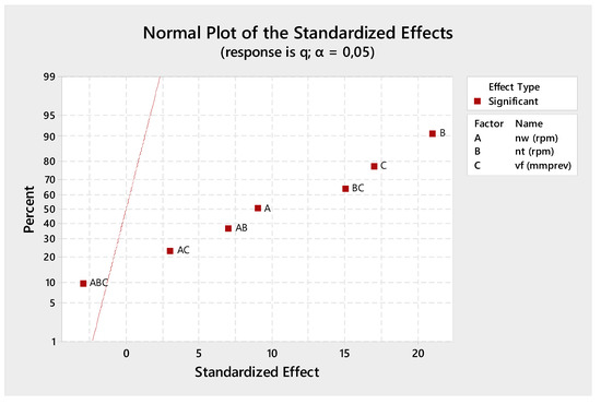 In addition, the plot indicates the direction of the effect. Processes A (working speed), B (cutting speed) and C (axial speed), and interactions AC, AB and BC, have a positive standardised effect. When these processes change from the low level to the high level of the factor, the response increases. The interaction ABC (between working speed, cutting speed and axial speed) (B) has negative standardised effects (but is not statistically significant, thus, it can be excluded from the optimised process). When the ABC interaction increases, the q (productivity) response decreases.
