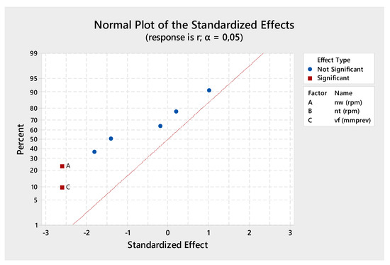 We use a normal probability plot of the effects to determine the magnitude, direction and the importance of the effects (see Figure 4, Figure 5, Figure 6 and Figure 7). On the normal probability plot of the effects, effects that are further from zero are statistically significant. The colour and shape of the points differ between statistically significant and statistically insignificant effects. For example, in Figure 4, the main effects for factors A (working speed), B (cutting speed) and C (axial speed) and interactions AB, AC and BC are statistically significant at the 0.05 level (the ABC interaction is not statistically significant). These points have a different colour (compared to the ABC interaction) and shape from the points for the insignificant effects.