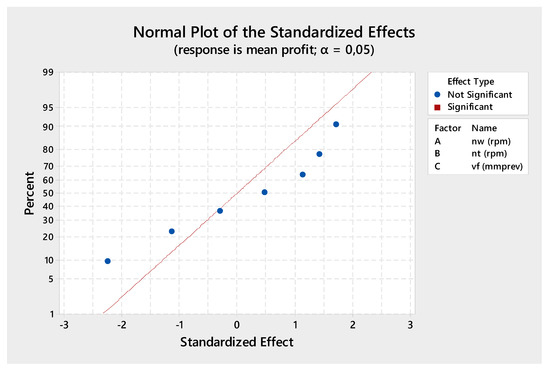 The first purpose of the factorial design was to find the factors and interactions influencing the mean variability of the ratio of the identical products. The result of these trials is shown in Table 2. For the significance test, it was decided to use the level of importance a = 5% (0.05). Then, if the p-value was less than the level of importance (0.05), the factor or interaction would be statistically significant. Productivity (q) has the main effects if the axial speed (vf), workpiece speed (nw), cutting speed (nt) and interactions between these process parameters are statistically significant. This finding is further supported by a normal plot (see Figure 2). Reliability (r) has the main effects if the axial speed (vf) and workpiece speed (nw) are statistically significant (see Figure 3). The mean variable cost (vc) has the main effects if the axial speed (vf), workpiece speed (nw) and cutting speed (nt) process parameters are statistically significant (see Figure 4). In addition, the mean profit (mean TP) shows no statistical dependence on any process parameter or interaction (see Figure 5), and the process parameters are statistically significant. This is probably because of the mutual compensation of production reliability and productivity. Therefore, we determined the mean profit (mean TP) for each process factor setting trial according to the following equation: