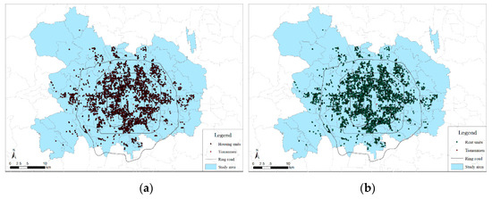 Spatial distribution of the housing community samples (a) and rental community samples (b) within our study area.