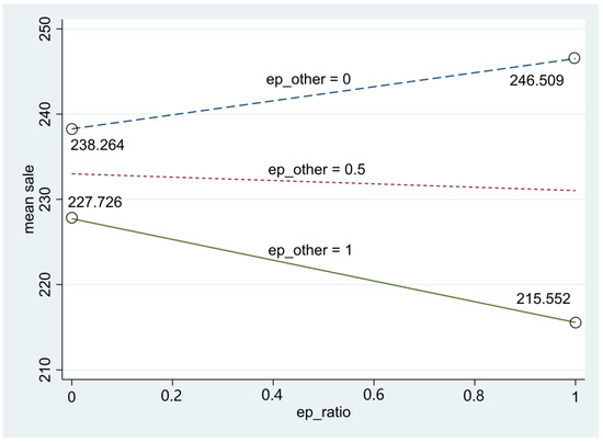The interaction term of Ep_ratio and Ep_other captures combined spillover effects in our model, that is, brand spillover from both line and brand extension. The interaction term Ep_ratio × Ep_other is negative and significant ( = −20.419, p < 0.006), indicating that as eco-packaging appeal is extended to its own and other product categories simultaneously with the same brand (concurrent line and brand extension), the brand-level sales of the own product category indeed decrease, showing a negative spillover effect (Figure 1).
