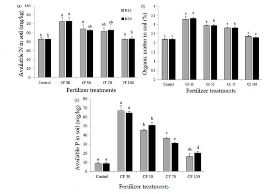 The contents of available N (a), organic matter (b) and available P (c) of soil at the end of the experiment in the control (without fertilizer), and CF30, CF50, CF70, CF100 fertilizer treatments (70:30, 50:50, 30:70, 0:100 ratios of compost and chemical fertilizer) under N25 and N50 application time conditions (25% or 50% chemical N fertilizer applied at the transplantation and 75% or 50% at the flowering stage). Values are means ± SE. Values with the same letter were not significantly different from each other at the p < 0.05 level.