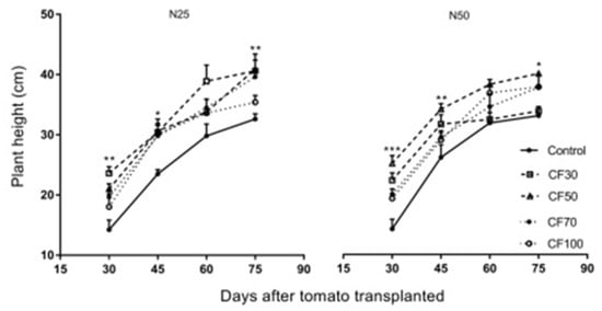 The plant height under different fertilizer treatments in N25 and N50 application time conditions. See Figure 1 for treatment abbreviations. Values are means ± SE. *, **, and *** represents significant difference of plant height among fertilizer treatments at p < 0.05, 0.01 and 0.001 levels, respectively.