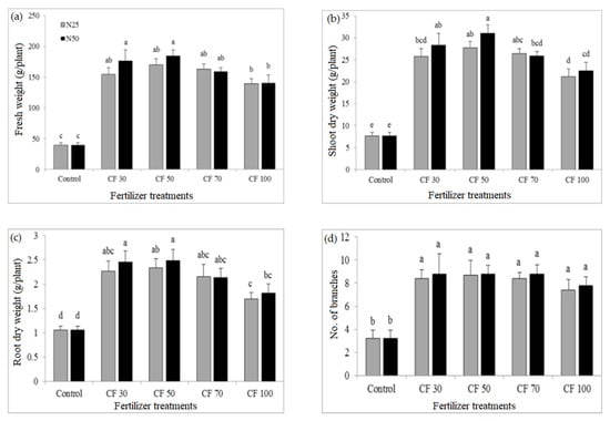 The fresh shoot weight, dry weight of shoots and roots, and branch numbers were all significantly affected by the fertilizer treatments, but not affected by the N application times and their interaction. All the parameters of plants in each fertilizer treatment were significantly higher than those of plants in the control under both N application time conditions (Figure 3). For the total number of branches (Figure 3d), no significant differences were detected between the pure chemical fertilizer treatment (CF100) and mixed fertilizer treatments (CF30, CF50, CF70). However, the fresh and dry shoot weights and the dry root weights of plants in CF50 were significantly higher than plants in CF100 under two N application time conditions (Figure 3a–c), though the difference of fresh shoot weights was not significant for the N25 (Figure 3a). The rate of improvement in fresh weights of shoots, dry weights of shoots, and root dry weights in mixed fertilizer treatments compared with the CF100 treatment were 17–22%, 22–31%, and 27–37% (under N25 conditions), and 13–31%, 15–38%, and 17–36% (under N50 conditions), respectively.
