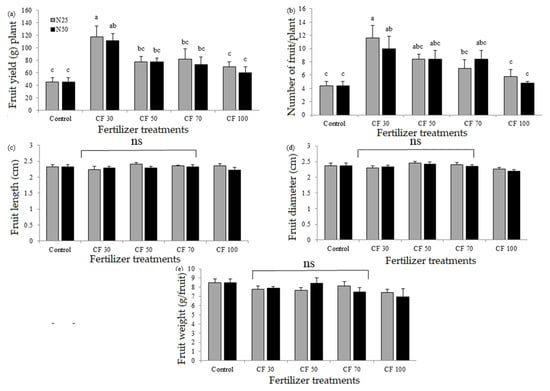 The plant yield properties of tomato plants, such as fruit yield and fruit numbers, were significantly affected by the fertilizer treatment but not by the main and interaction effects of N application time conditions. Plants in mixed fertilizer treatments showed a significantly higher yield than those in the control, and the yield of tomato increased with the increasing ratio of compost (Figure 5a,b). The tomato yield and fruit numbers in the CF30 treatment were significantly higher than those of CF100. Compared with the yield of the CF100 treatment, the treatments of CF30, CF50, and CF70 increased the yield and fruit numbers by 17–69% and 21–100% under N25 conditions, and 21–85% and 75–108% under N50 conditions. For an individual tomato fruit, the length, diameter, and weight per fruit were similar among each treatment (Figure 5c–e).