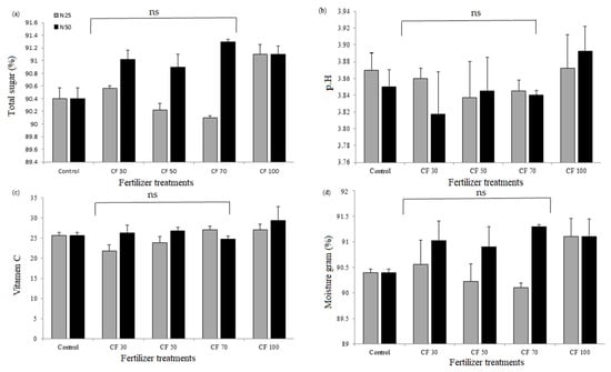 The contents of total sugar (a), pH (b), vitamin C (c), and moisture (d) in the fertilizer treatments under two N application time conditions. See Figure 1 for treatment abbreviations. Values are the mean ± SE. ns represents insignificant differences among all fertilizer and application time treatments at the p < 0.05 level.