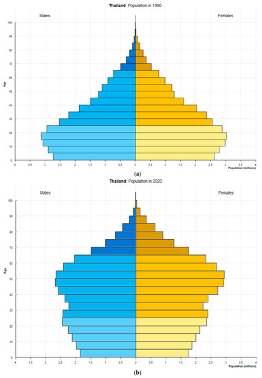 The statistical trend of the Thai population by age: Population pyramids of Thailand in (a) 1990 and (b) 2020. Source: Population Division [5].