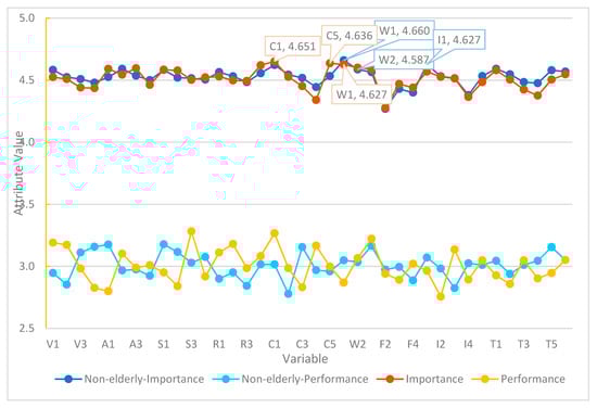 Value of importance and satisfaction for elderly and non-elderly passengers.