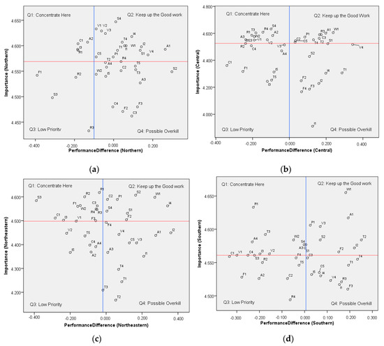 Gap1 indicates users’ satisfaction arising from their expectations before using the service and awareness after using the service. If, after service, the customers are more satisfied with the service than expected, they are satisfied [26]. From this approach, the difference between perception and expectations was negative, which means that the service as perceived by customers after using the service was less than expected. The results were negative in all five areas, as shown in Table 8, and as supported by Yu-ChunChang [15]. When plotting the satisfaction and importance values of all factors on the line graph, we found that the total passenger satisfaction was low. This approach explained that after using services, customers perceive them as being unsatisfactory, or expected that the service would have been better. This analysis has limitations, as indicated by the case of cleanliness and neatness of stations and stop signs. The station is clean (T2) and the temperature inside the vehicle is appropriate (V3) received the same difference value in the Northeastern area (gap = 1.256). However, given the T2 importance (4.167) and performance (2.91) and the V3 importance (4.407) and performance (3.15), these attributes had different importance values that were not reflected in the gap value.