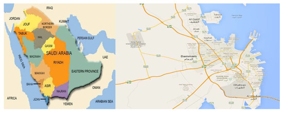 Regarding the state-of-the-art review given in the previous section, the overall aim of this study was to gain a fundamental understanding of the gendered experience of a sample of public transport users and consider their aspirations and needs into daily mobility. A survey was carried out to collect the dataset in the case study area, the Dammam Metropolitan Region (DMR) in the Kingdom of Saudi Arabia (KSA). The DMR is located within the Eastern Province of the country and includes major cities, including Dammam, Khobar, and Dhahran (Figure 1).