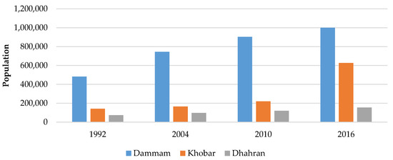 The Eastern Province carries some of the biggest oil fields, which significantly contributes to the economic growth of the Kingdom. The DMR is the central exporting point for petroleum and natural gas within the Eastern Province. Therefore, this region has undergone substantial urban development within a brief period. According to the Central Department of Statistics of the KSA, the DMR has experienced rapid population growth during the last three decades [45,49] (Figure 2).