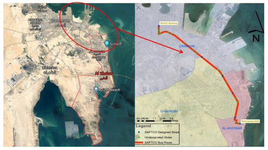 In connection with this development, the local public transport also was improved with the new investments. For instance, SAPTCO has provided the intra-city public transport in the DMR. However, the relatively high economic status of the citizens in this region encourages heavy car usage [45]. Moreover, the low quality of the limited public transportation does not meet the residents’ mobility needs. Figure 3 shows that the only public transport route (SAPTCO bus) is around 24 km along a single alignment. Thus, due to the limited public transport infrastructure, the women population of the region also tend to use private vehicles [11,45]. Similarly, the typical travel mode for women, who do not own personal cars, is a taxi available around the region during any time in a day. Moreover, ref. [10] found that taxis are far more preferred than public transport due to accessibility and comfort.