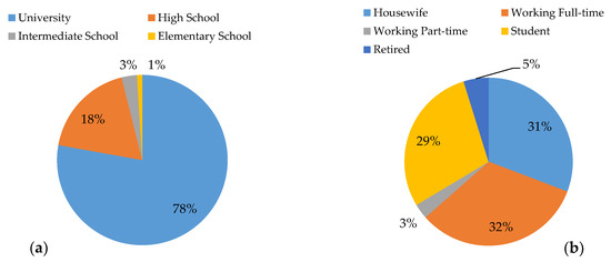 A total of 78% of the respondents had university graduation, followed by high school with 18% (Figure 6). A total of 32% of the respondents had a full-time professional activity while 31% were housewives and 29% were students.