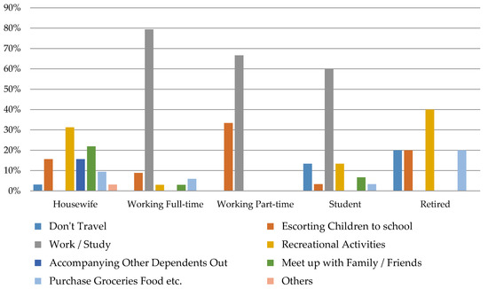 Women had different mobility needs, which led them to have various purpose-driven trips. These trips varied according to their occupations. Figure 7 illustrate the relationship between the mobility purpose of women and their occupations. Trips by homemakers were more wide-ranging, reflecting their varied everyday responsibilities, like escorting children to school, recreational activities, accompanying other dependents out for medical checkups, meeting up their friends and relatives, and purchasing groceries. In contrast, full-time and part-time workers traveled mainly for work and escorting their children to schools. Students primarily had trips for their study purposes, recreational activities, and meeting their friends and relatives. Recreational trips were found to be a significant category of trips found for retired women, followed by trips associated with escorting children to school and purchasing of goods and groceries.