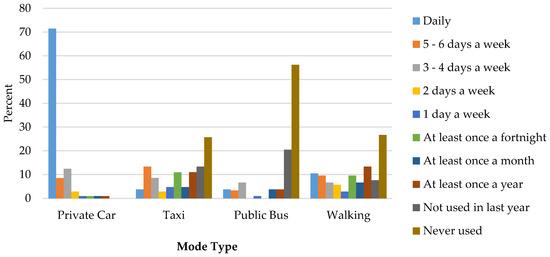 Regarding the choice of transport modes in the region, there were only four alternatives: a private motor vehicle, taxi, SAPTCO public bus, and walking. Women’s mobility choice highly depended on their daily travel needs, accessibility, and availability. The results of this study showed that 71.4% of these women have been using private cars for their everyday trips (see Figure 8). The taxi was the second most favorable and frequent traveling mode, and lastly the SAPTCO public bus and walking. Surprisingly, the percentage of women commuting with SAPTCO public buses was negligible in comparison to other choices. Around 56% of women never used this public bus before, and 20% did not even take it since last year.