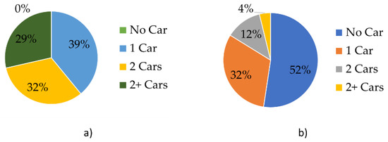 As previously mentioned, the use of a private car is quite common in the Saudi Arabia. Similarly, in the DMR response survey, it was found that 100% of the households owned private vehicles. As shown in Figure 9, 61% of the households had more than a single car. Although private household cars were common, it was found that these vehicles were not available for driving for women. Therefore, the availability of these personal vehicles was time-bound, and women were immobile during the working hours of male family members. Approximately 52% of the women had no access to the private household car during the day, particularly between 09:00 a.m. and 05:00 p.m., which appeared to be a significant barrier to their daily mobility.