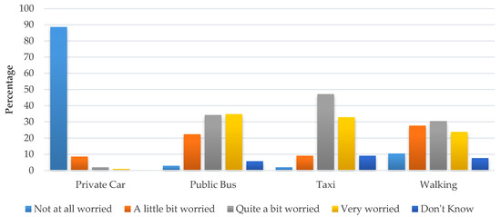 - Security is a paramount concern that women face while traveling with public buses and taxis, as well as access to these services. Figure 10 shows the level of security of women while using and accessing different available modes. It is apparent that personal safety was at stake with all modes except the private car, i.e., about 88.6% of women were not worried while using a private vehicle. On the contrary, 34.8% of the women were anxious, and 34.3% of women were quite a bit concerned while using and accessing a SAPTCO public bus. The results highlight that the significant reason for making women feel unsafe is poorly maintained buses and bus stops where there are no specific provisions to make them convenient, accessible, and safe.