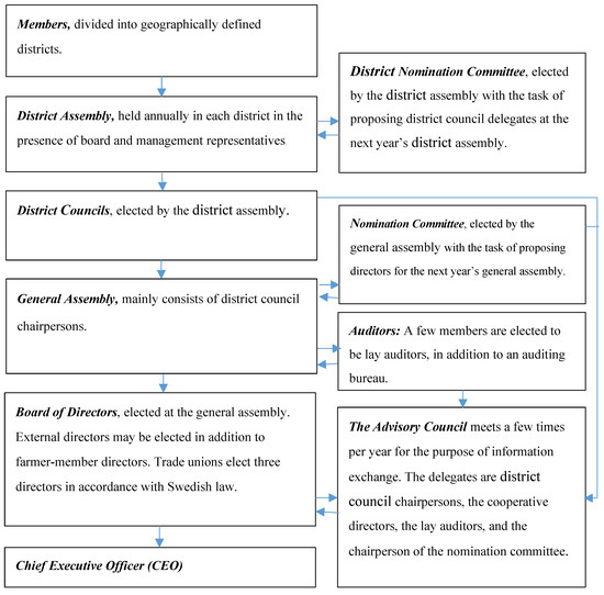 The Swedish law on cooperatives prescribes a traditional governance structure. The general assembly is the highest decision-making body in a cooperative. The general assembly in larger cooperatives consists of delegates, who are elected by district assemblies to which all members are invited [10]. When this two-tier system was introduced to substitute the former three-tier system—with local, regional, and apex levels—the cooperatives obtained substantially lower democracy costs, as the number of elected representatives was reduced [57].