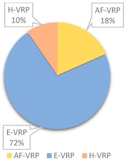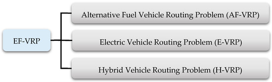The classical VRP is one of the fundamental problems in operational research, which seeks to determine how a set of vehicles can serve a set of customers in such a way as to minimize the total cost of travel in a transportation network. The green VRP is a variant of VRP, which seeks to minimize both the economic cost and the environmental cost of vehicle routing [24]. According to Lin et al. [25], the VRPs that follow a green approach can be divided into three broad categories: Green-VRP, Pollution-Routing Problem (PRP), and VRP in Reverse Logistics (VRPRL) (Figure 2). One of the subcategories of the Green-VRP is to use EFVs (EF-VRP in Figure 2) [25].