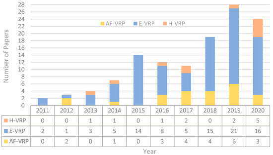 The number of papers published on AF-VRP, E-VRP, and H-VRP.