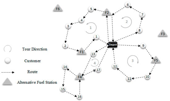 The AF-VRP was first introduced by Erdoğan and Miller-Hooks [21]. In that work, a set of AFVs fleet located in a central depot has to serve a set of customers in a distribution network. The AFSs are placed along the paths to ensure that the AFVs can serve customers adequately. In that study, the problem had been formulated in the form of a Mixed Integer Linear Problem model, which ensures that all customers are visited only once, fuel tank level upon arrival at a node is non-negative, and conformity to the maximum tour duration constraint is guaranteed provided that each tour begins and ends at the depot. The problem was solved by two heuristic methods with an improvement technique. An example of a feasible solution for this AF-VRP is illustrated in Figure 5. In this example, there are 17 customers and 6 AFSs, and refueling operations are performed to continue the route at AFSs, and the level of vehicle tanks is refilled when the vehicles arrive at AFSs vertices. In the first tour, the AFV moves from the depot to the customer 5 considering relatively a long path and consumes considerable stored fuel. So, before arriving at the location of customer 5, it needs to refuel at AFS 2. To arrive at the depot on the first tour, the vehicle must visit another AFS one more time. Because of the short distance on the second tour, there is no need to refuel. Serving customers is provided on tours 3 and 4, similar to the first tour.