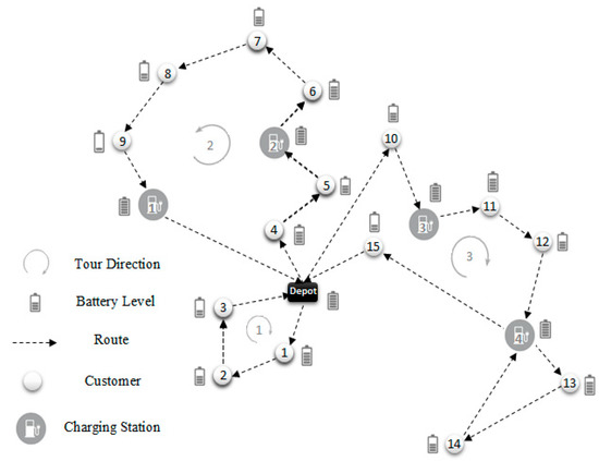 Generally, the E-VRP is defined on an undirected, complete graph G = (V; A). In this problem, a set of electric vehicles serves as environmentally friendly vehicles. Figure 6 presents an example of E-VRP. In this example, there are 15 customers and 4 charging stations, and full charging in the depot and charging stations is made possible. For better understanding, the battery state of charge at the time of arriving each node is specified in the figure. In the first tour, when the EV moves from the depot to customer 10, considering the relatively long path and using half of the stored energy, it visits charging station 3 to continue the path and serve customers 11 and 12, and continues its path after the recharging process. In the second tour, considering the proximity of customers 1, 2, and 3, there is no need to recharge, and the EV returns to the depot after servicing the customers. On the third tour, after visiting customers 13 and 14, and considering the long path to customer 15, the EV returns to the charging station and fully charges itself.