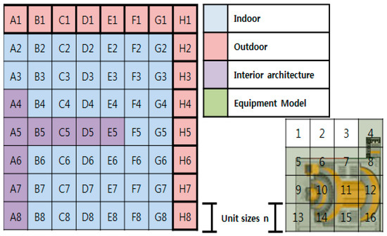 The data simplification process starts first by removing the noises. Noise refers to unnecessary data other than equipment and on-site environmental information (pre-installed equipment, structures, etc.), and the target of noise may vary depending on the purpose. A node exists if data exist at any point in the node in the simplification process based on 3D shape information under the assumption that noises have been removed. This can be checked by referring to cell no.4 of the facilities model in Figure 2. Figure 2 shows a simplified example of transforming space and equipment into grid forms only considering the horizontal and vertical (x, y) coordinates to illustrate the concept. As the final goal of this study was space analysis based on 3D grid method, all three coordinates of x, y, z including the height were analyzed. The grids labeled A1 to H8 in Figure 2 represent the total space of the site environment for equipment installation indicated as grid, and grids labeled 1 to 16 illustrate an example of converting the equipment to be installed into 3D grids.