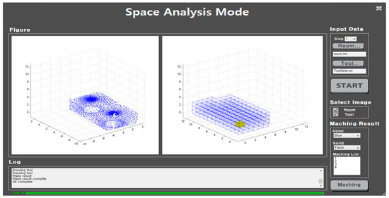 Figure 10 shows the software processing sequence. Input data can be divided into four configurations: the setting part to configure the grid box size to perform the space analysis; the input part to add point cloud data of the space to be analyzed; the tool part to set the starting coordinate point for installation; and lastly the start part to perform the final algorithm and calculation. The user first sets the grid box size according to the accuracy to be obtained and inputs the shape information data collected through the laser scanning operation. Thereafter, the data for setting a required space are further added to start the calculation.
