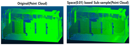 Sub-sampling of point cloud data was performed first for data optimization. Sub-sampling refers to a function that sets the user’s desired space within the space consisting of points and reduces several points in the set space to a single point. It is used to reduce the load for handling and loading of massive point cloud data and to reduce the data volume. The data collected through laser scanning resolution set at Mid, has the capacity of 259 MB and consists of total 14,317,597 points. Increasing the resolution in the laser scanning step increases the capacity and number of points. Figure 6 below shows the example of sub-sampling.