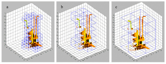 3D space partitioning methods can be largely divided into regular partitioning and irregular partitioning. Regularly segmented space can be represented by voxel. Space partitioning methods such as voxel model objects in the 3D space as groups of nodes having the same size. If the object has a curved boundary, the smaller the cell size is, the higher the accuracy that can be obtained because the accuracy is determined by the cell size. However, reducing the cell size to increase accuracy also has the disadvantage of increased calculation time and memory consumption [29]. A 3D grid structure is a representative space partitioning method that uses multi-resolution cube grid structures. It distinguishes spaces by creating cube-shaped grids with free size change even though they have the same length, width, and height. Multi-resolution cubes can be changed to create multiple grids as needed [30].