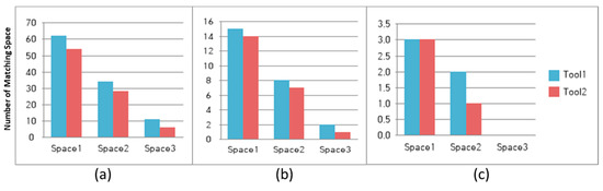 The equipment and space transformed into 3D grids were matched through the above process, and the results were calculated. The results are shown in Figure 12. The numbers on the graph represent the number of points in which the correlated spaces (indicated as Space 1, Space 2, and Space 3) and equipment (indicated as Tool 1 and Tool 2) in the algorithm matched.