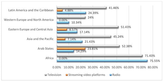 As can be observed from Figure 1, of the three listed platforms, television is the most widely used, although not in a balanced way among the different regions. The geographical areas with a greater number of low-income countries or economies supported the diffusion of teaching or teaching-learning processes via television (an exciting educational innovation in the classroom in the 1960s, and even useful today outside of the classroom) or radio, which was an exciting innovation for use in schools in the 1930s. This is clearly reflected in the African region; 41 countries have mostly implemented educational initiatives through television (71.43%) and radio (77.55%).