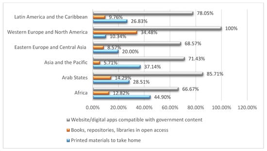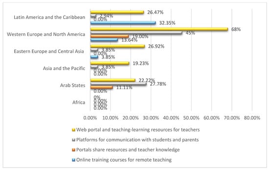 Figure 3. Percentage of countries by region that have developed learning platforms and tools for teachers after COVID-19. Source: United Nations Educational, Scientific and Cultural Organization (UNESCO) [47,48].