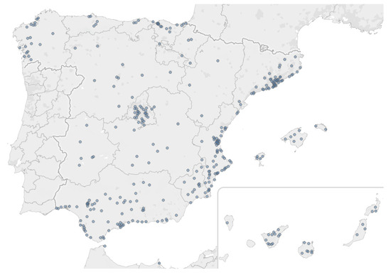 30], 50,000 to 500,000 residents), the extremely fragmented municipal distribution in Spain requires the employment of a more modest range. Of the 8131 municipalities in Spain, 61.5% have less than 1000 inhabitants, and 90.7%, less than 10,000. Only 63 cities exceed 100,000 inhabitants and only 6 would be above half a million, so it has been estimated that the interval of 20,000 to 100,000 residents is a fair representation of the concept of “medium-sized city” in Spain. This range encompasses 350 municipalities (2019 municipal register) with 13,841,094 inhabitants (29.4% of the Spanish population, as can be seen in