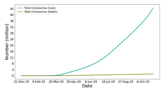 The novel coronavirus, also known as Coronavirus Disease 2019 (COVID-19), first emerged in Wuhan (P.R. China) in late fall 2019 and has now spread to 213 countries around the globe [1]. The World Health Organization (WHO) declared COVID-19 a pandemic on 11 March 2020, considering its outbreak in many countries [2]. As of now, more than 44 million people have been infected by this highly infectious disease and over 1.1 million people have died [1,3]. The current fatality rate among closed cases is about 10%, which speaks volume about the sheer severity of the pandemic. The increasing number of coronavirus cases and deaths poses challenges to the healthcare system, economic development, supply chain, education, and travel pattern of the people [4]. Figure 1 represents the increasing number of coronavirus infection cases and deaths (in million) in the world from 31 December 2019 to 29 October 2020. To control the spread of COVID-19, governments have implemented travel bans through national lockdown, stay-at-home order, restriction on mass gathering and non-essential travel, which further affected people’s mobility and social distancing practices.