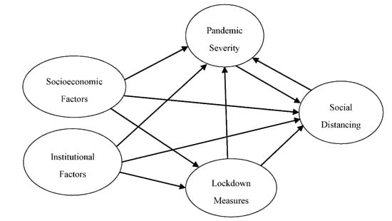 Based on the literature review, a conceptual framework has been developed (Figure 2). The conceptual framework posits that socioeconomic and institutional contexts have a significant role in pandemic severity, social distancing, and in the enactment of lockdown measures. Different lockdown measures implemented in affected countries influence pandemic severity and social distancing (i.e., mobility). Moreover, lockdown measures indirectly influence pandemic severity by changing people’s mobility. Social distancing has a direct effect on pandemic severity. A high level of social distancing (i.e., reduction of mobility) is considered an effective measure to reduce infectious diseases. However, pandemic severity also has a direct effect on how people effectively practice social distancing, which implies that self-motivated people reduce their mobility when the severity of the pandemic is higher.