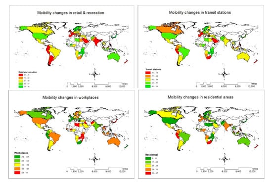 Google prepared a COVID-19 Community Mobility Report to help policymakers and public health professionals to understand changes in mobility in responses to lockdown measures (e.g., travel ban, work-from-home, shelter-in-place, restriction on public gathering) [38,45]. This report shows how visits and length of stay at different places, such as retail and recreation (e.g., restaurant, café, shopping center, theme park), workplaces (i.e., place of work), transit stations (e.g., subway stations, seaport, taxi stand, rest area), residential areas (i.e., place of residence), parks (e.g., public park, national forest), grocery stores and pharmacies (e.g., supermarket, convenience store, drug store) changed as of April 17 compared to a baseline value, with a potential to reduce the impact of COVID-19 pandemic. The baseline value is the median value of the corresponding week during the 5-week period from 3 January to 6 February 2020. The data were collected from the Google account holders who have turned on their travel location history. This study uses mobility changes in retail and recreation, workplaces, transit stations, and residential areas for 88 countries (Figure 3). Due to the ambiguity of the nature of visits and trips to grocery stores and pharmacies and the inconsistent definition of parks across countries (i.e., only include public parks), mobility changes in these two points of interest (POIs) were excluded from the study.