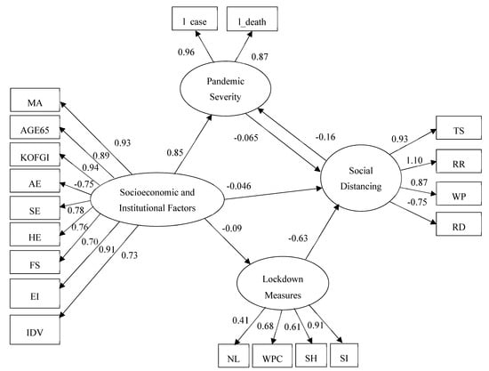 Socioeconomic and institutional factors: This is the only exogenous latent dimension in the model. It comprises nine observed variables: MA, AGE65, KOFGI, AE, SE, HE, FS, EI, and IDV. Socioeconomics and institutional factors are positively associated with median age (0.925), elderly people (0.887), level of globalization (0.936), employment in the service sector (0.777), expenditure on health (0.762), female smokers (0.701), level of education (0.911), and the degree of interdependence in the society (0.734). Conversely, it is negatively associated with employment in the agricultural sector (−0.746). This latent dimension can therefore be interpreted as an indicator of urbanity and modernity. Moreover, socioeconomic and institutional factors are positively associated with pandemic severity (0.847) and negatively associated with lockdown measures (−0.090) and social distancing (−0.046). Thus, one unit change in socioeconomic and institutional factors leads to an increase in pandemic severity by 0.847 unit through increases in the number of elderly people, level of globalization, employment in the service sector, and reduction in employment in the agricultural sector. In contrast, one unit change in socioeconomic and institutional factors lead to a decrease in lockdown measures and in social distancing by 0.090 units and 0.046 units, respectively, by encouraging people to be more considerate of their impact on the rest of society. However, the impacts of socioeconomic and institutional factors on lockdown measures and social distancing are very minor and statistically non-significant at P-value 0.05.