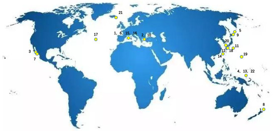 In past decades, many scientists have reported their work on HT activities and their surrounding environments. But early studies mainly concentrated on HT systems located at deep ocean, e.g., the East Pacific Rise or the Central Indian Ridge [11,12]. Research on shallow-water hydrothermal (SHT) systems were seldom found until the end of the 20th century [13]. Tarasov defines shallow-water hydrothermal (SHT) vents as vents located at a depth of 200 m or less considering the degree of obligacy of fauna [14]. According to this definition, 22 SHT zones have been found on Earth (Table 1) [14]. Their brief locations were indicated in Figure 1.