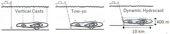 One traditional way of searching for HT plumes in vast waters is surveying with vessels or ROVs equipped with towed multi-sensor systems (Figure 2). Usually a combination of physical and/or chemical sensors integrated in a protective shell is deployed to the depth where the HT plume may occur. The sensor bundle is connected to the vessel with cables to ensure real-time communication. Thus, when the sensors get in touch with the HT plume during navigation, the feature anomalies can be instantly recognized. To further improve the chance of encountering an HT plume, sometimes the deployment depth of the towed sensors is continuously adjusted to forms a “w” shaped trace, or a chain of sensors deployed discretely at different depths is applied (Figure 1). When the existence of an HT plume is confirmed, a refined survey at a lower depth or an up close survey such as optical observation will be performed to further locate the position of HT vents.