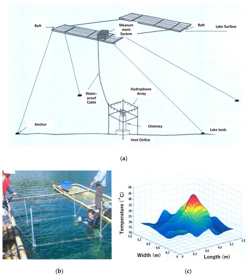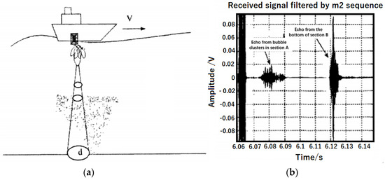 Lin proposed an acoustic method for the remote detection of HT vents (Figure 5a) [63]. In his study, a transducer was fixed to the bottom of a vessel which cruised around HT areas. Sound waves were directly emitted downward to the seafloor. The anomalies in reflection tells the existence of possible HT vents and their positions. An acoustic HT detection system based on the abovementioned scheme was developed and tested in Song Hua Lake, Jilin Province, China. A fenestrated hose with one end connected to an air pump was deployed to the bottom of the lake to generate bubble clusters. A vessel equipped with the transmitter surveyed in an eight shaped track on the surface while emitting sound waves straightly downward at a carrier frequency of 20/200 Hz. The depth of the experimental area was about 40 m. Through analysis of the received signal, the depth and spreading range of bubble clusters were obtained (Figure 5b).